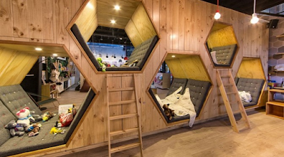 Nesta biblioteca, podemos encontrar sofás que parecem casulos, criados especialmente para as crianças que podem colorir e brincar nesses espaços.